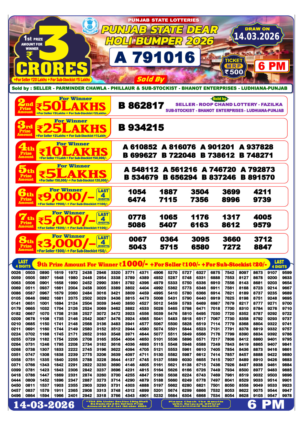 PUNJAB STATE DEAR HOLI BUMPER 2026 Lottery Result 14 March 2026 14 March 2026 তারিখে অফিসিয়ালভাবে প্রকাশিত হয়েছে। এটি Government Approved Bumper Lottery Result। এখানে আপনি সম্পূর্ণ রেজাল্ট শিট দেখতে পারবেন এবং অফিসিয়াল PDF ডাউনলোড করতে পারবেন।