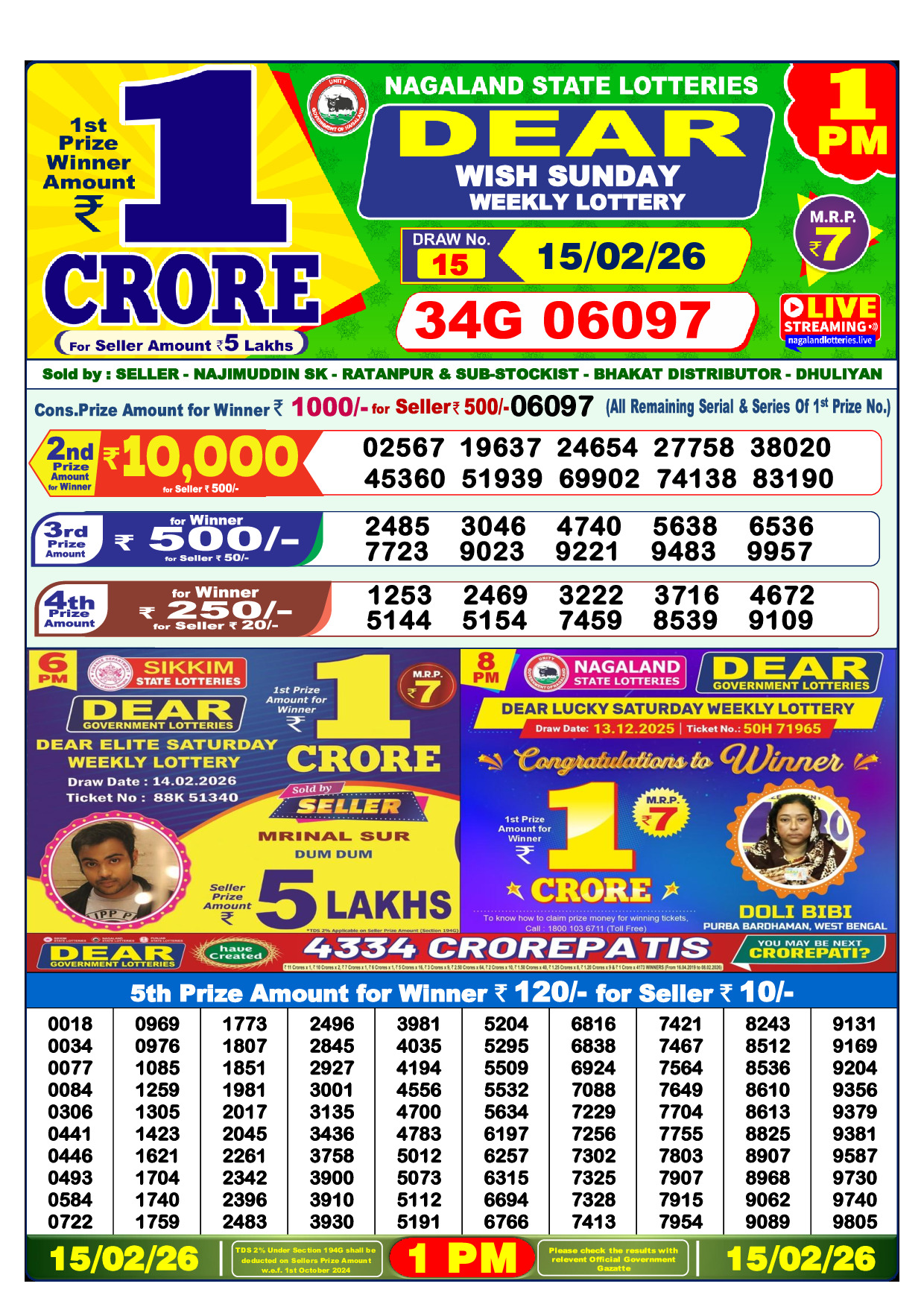 Dear Wish Morning Sunday 1 PM Lottery Result 15 February 2026