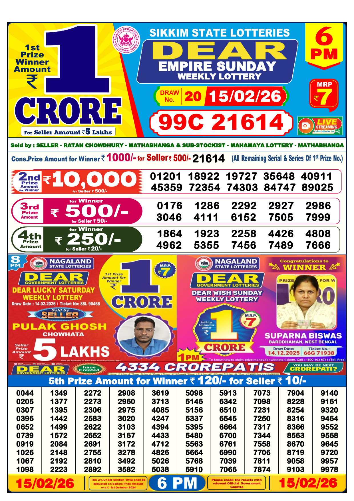 Dear Wish Morning Sunday 1 PM Lottery Result 15 February 2026 published on 15 February 2026. Download the official lottery result PDF below.
