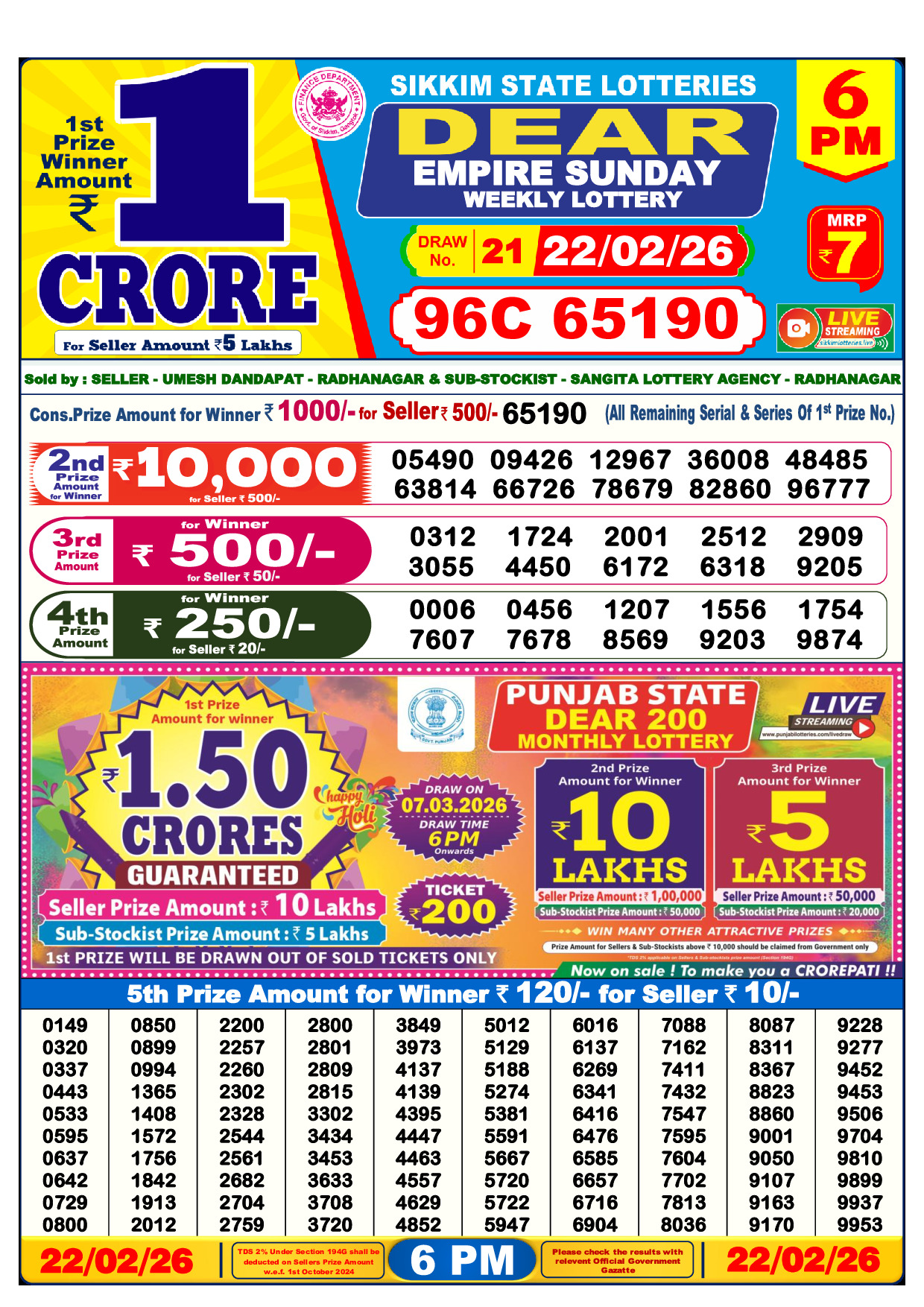Dear Empire Day Sunday 6 PM Lottery Result 22 February 2026
