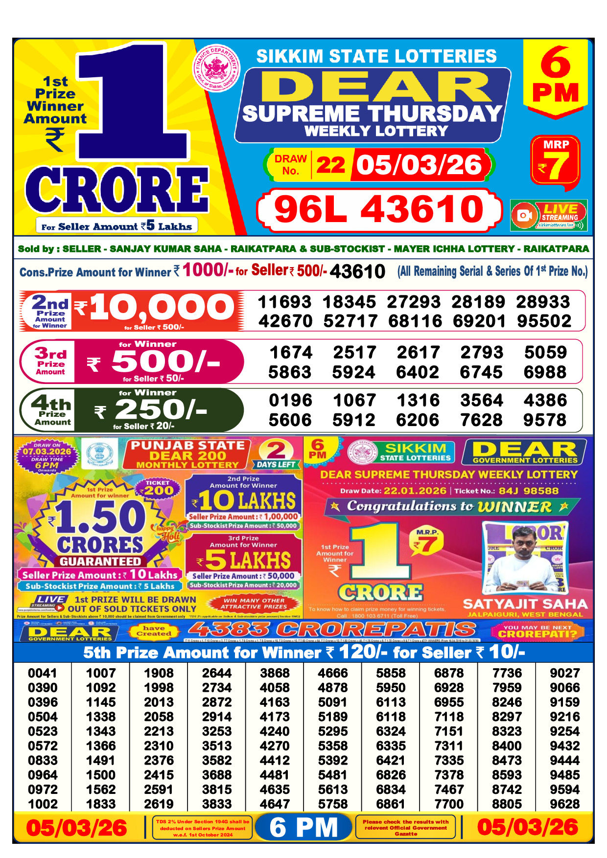 Dear Supreme Day Thursday 6 PM Lottery Result 05 March 2026