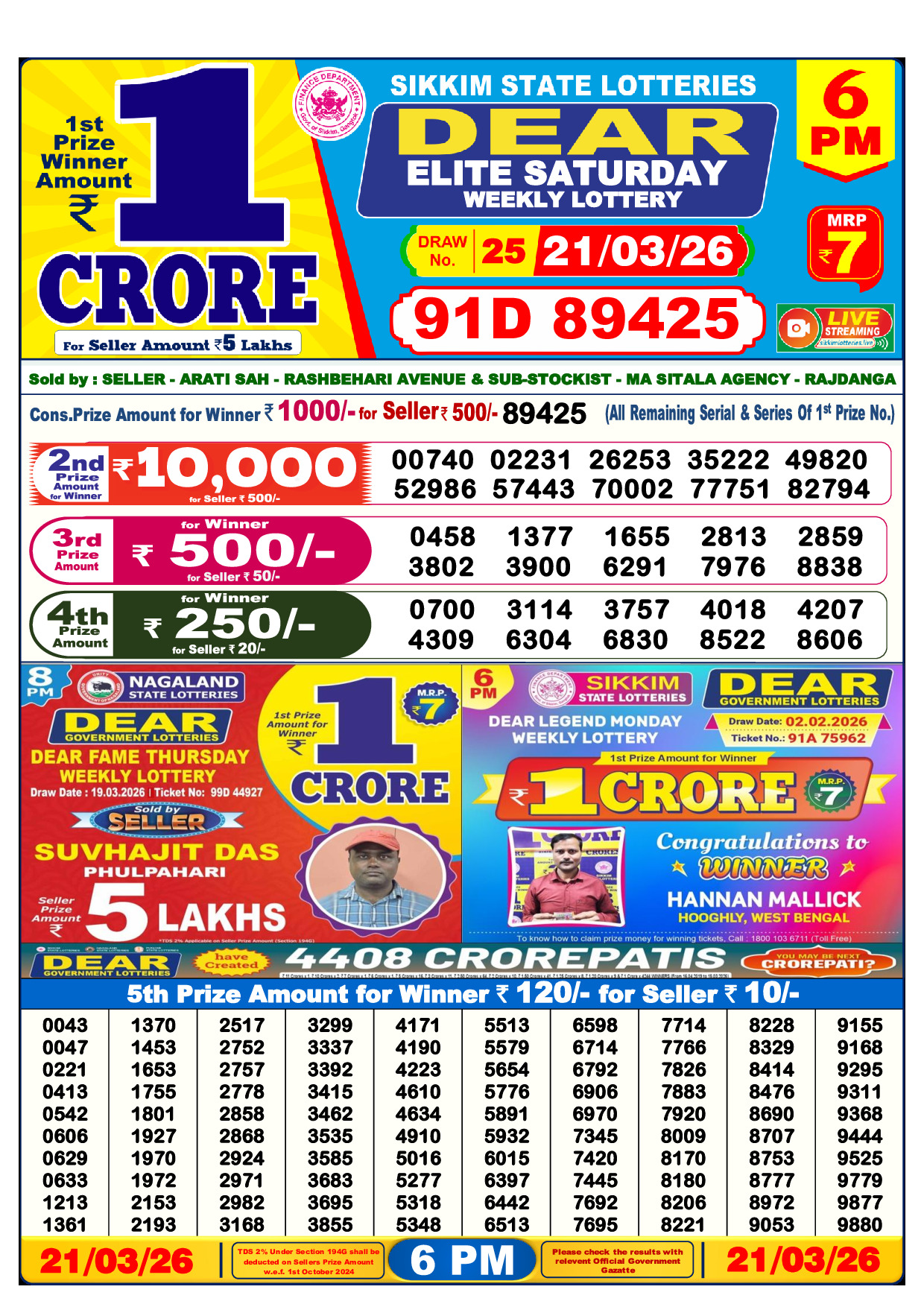 published on 21 March 2026. Download the official lottery result PDF below.