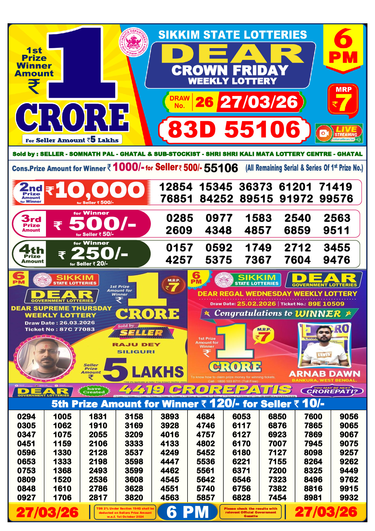 Dear Crown Day Friday 6 PM Lottery Result 27 March 2026