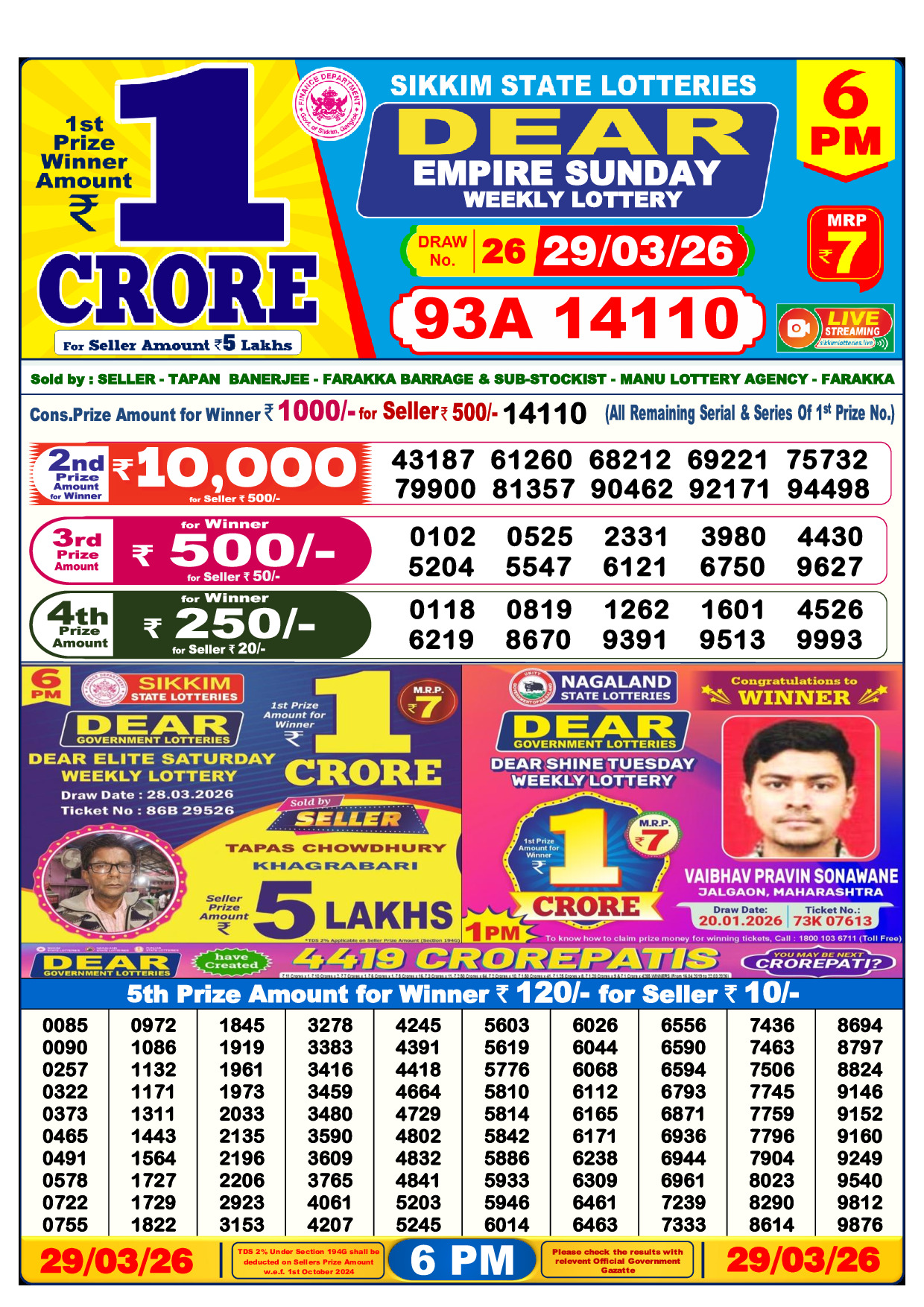 published on 29 March 2026. Download the official lottery result PDF below.