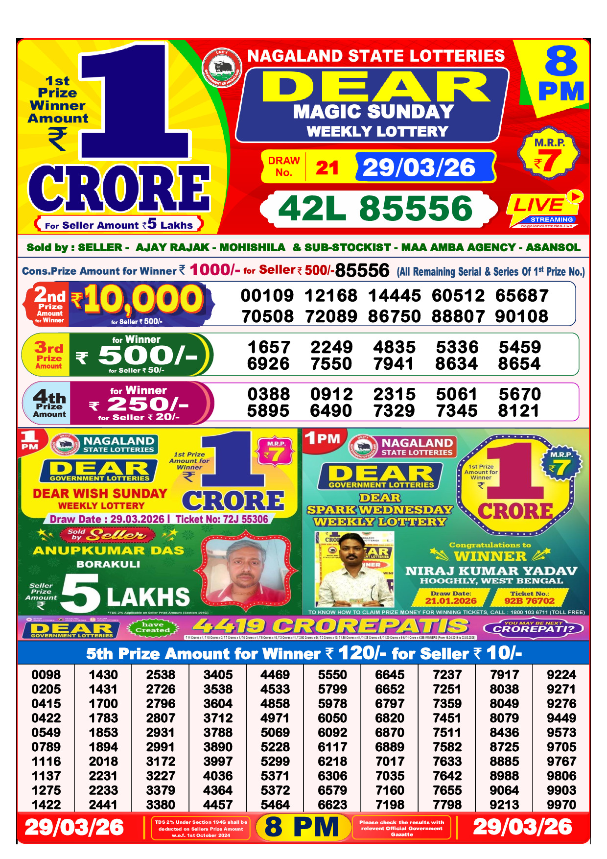 published on 29 March 2026. Download the official lottery result PDF below.