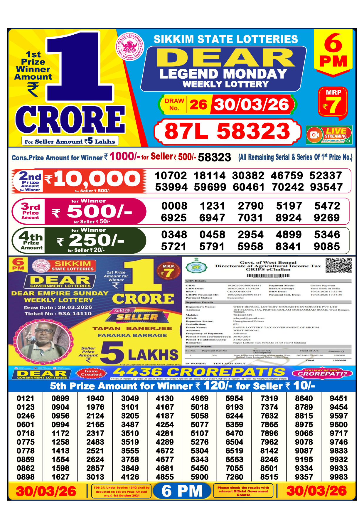 Dear Legend Day Monday 6 PM Lottery Result 30 March 2026