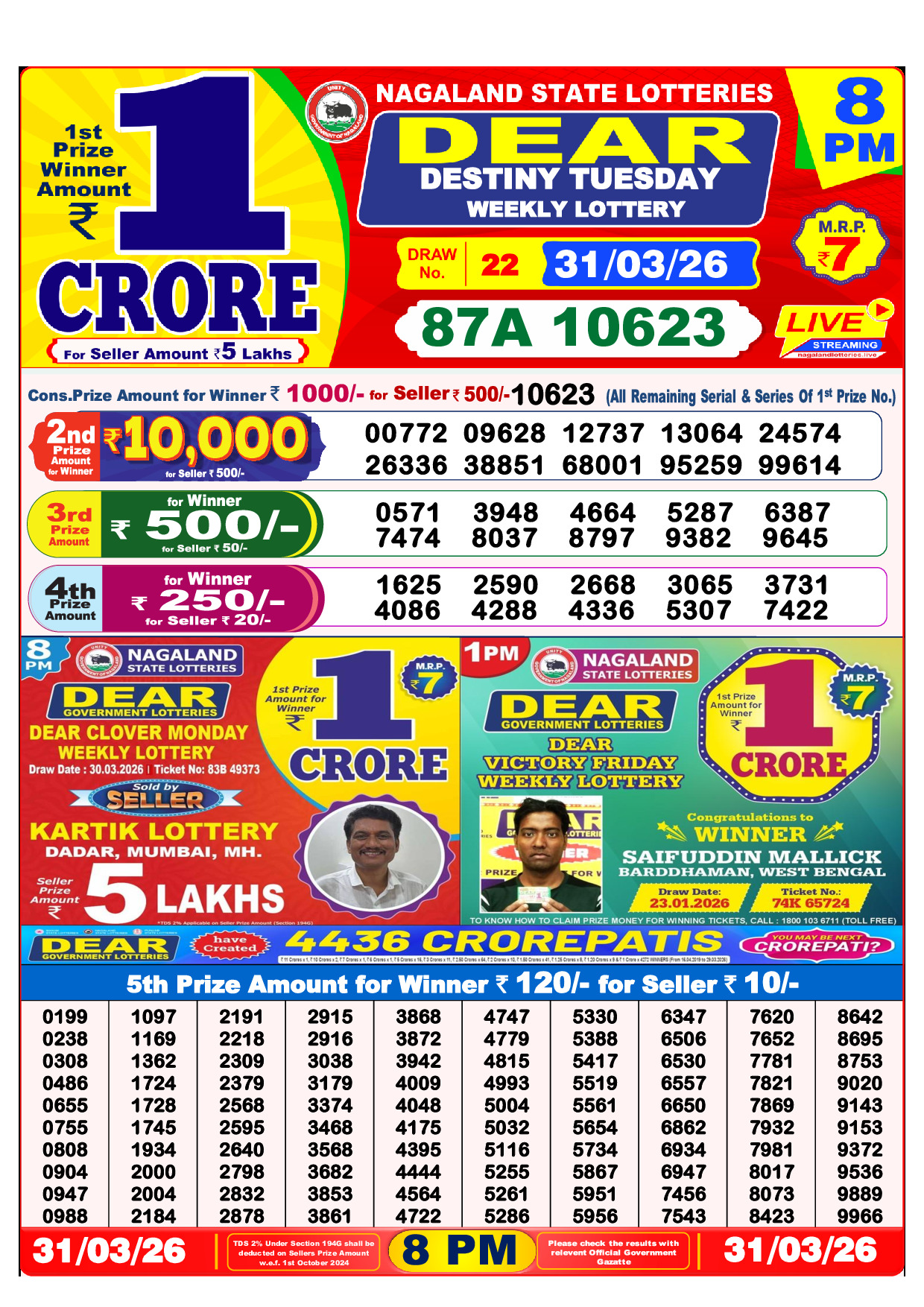 Dear Destiny Evening Tuesday 8 PM Lottery Result 31 March 2026