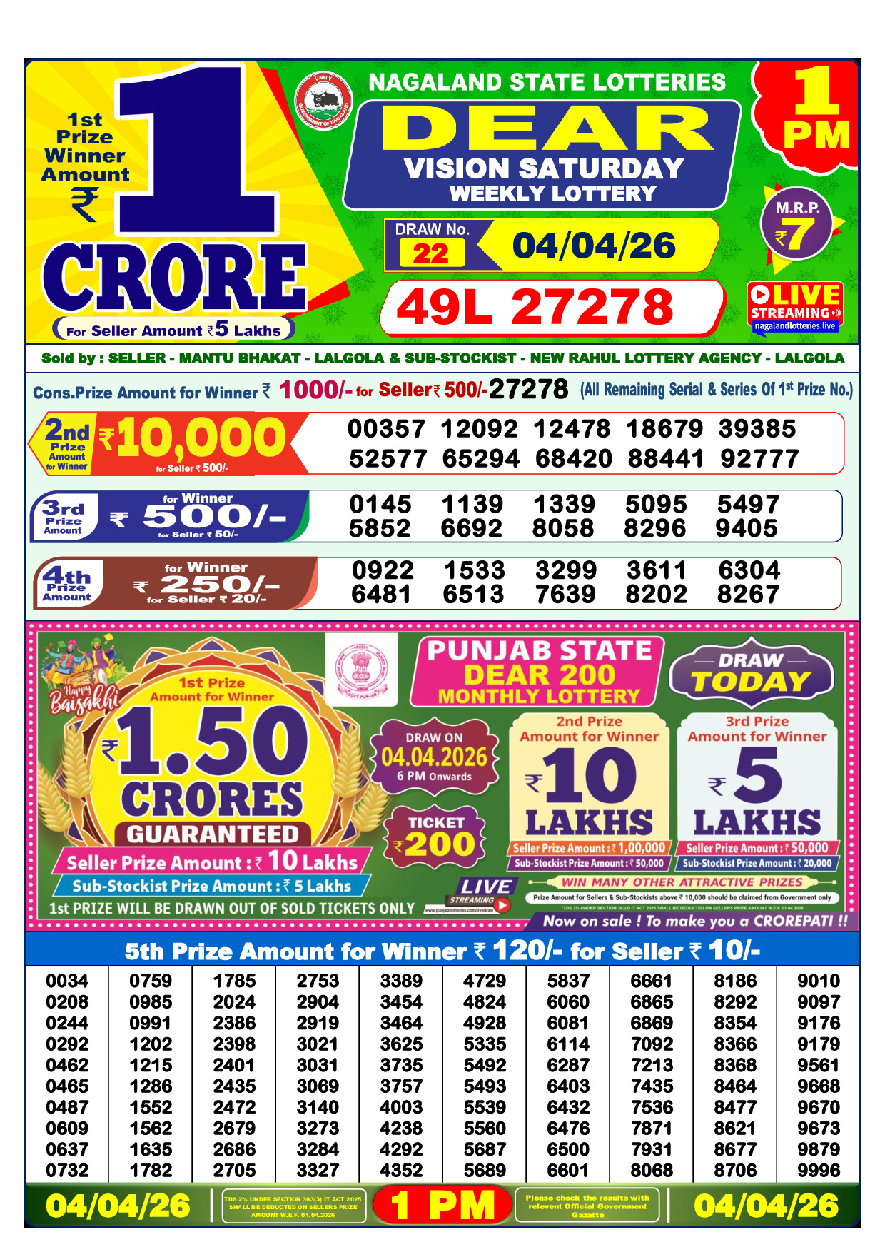 Dear Vision Morning Saturday 1 PM Lottery Result 04 April 2026