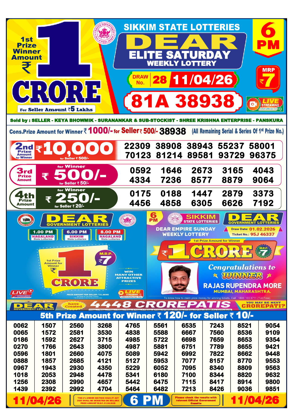 Dear Elite Day Saturday 6 PM Lottery Result 11 April 2026