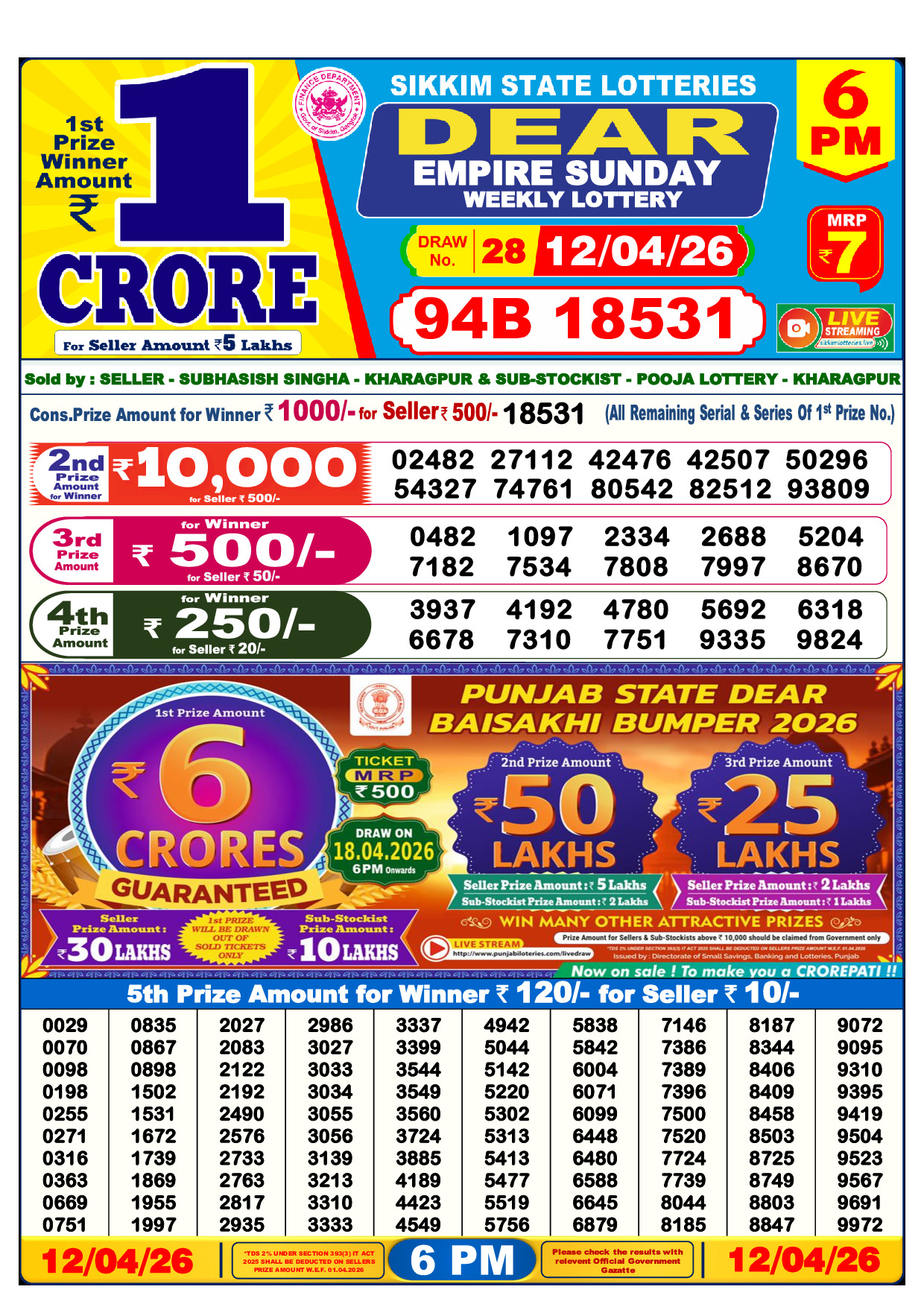 Dear Empire Day Sunday 6 PM Lottery Result 12 April 2026