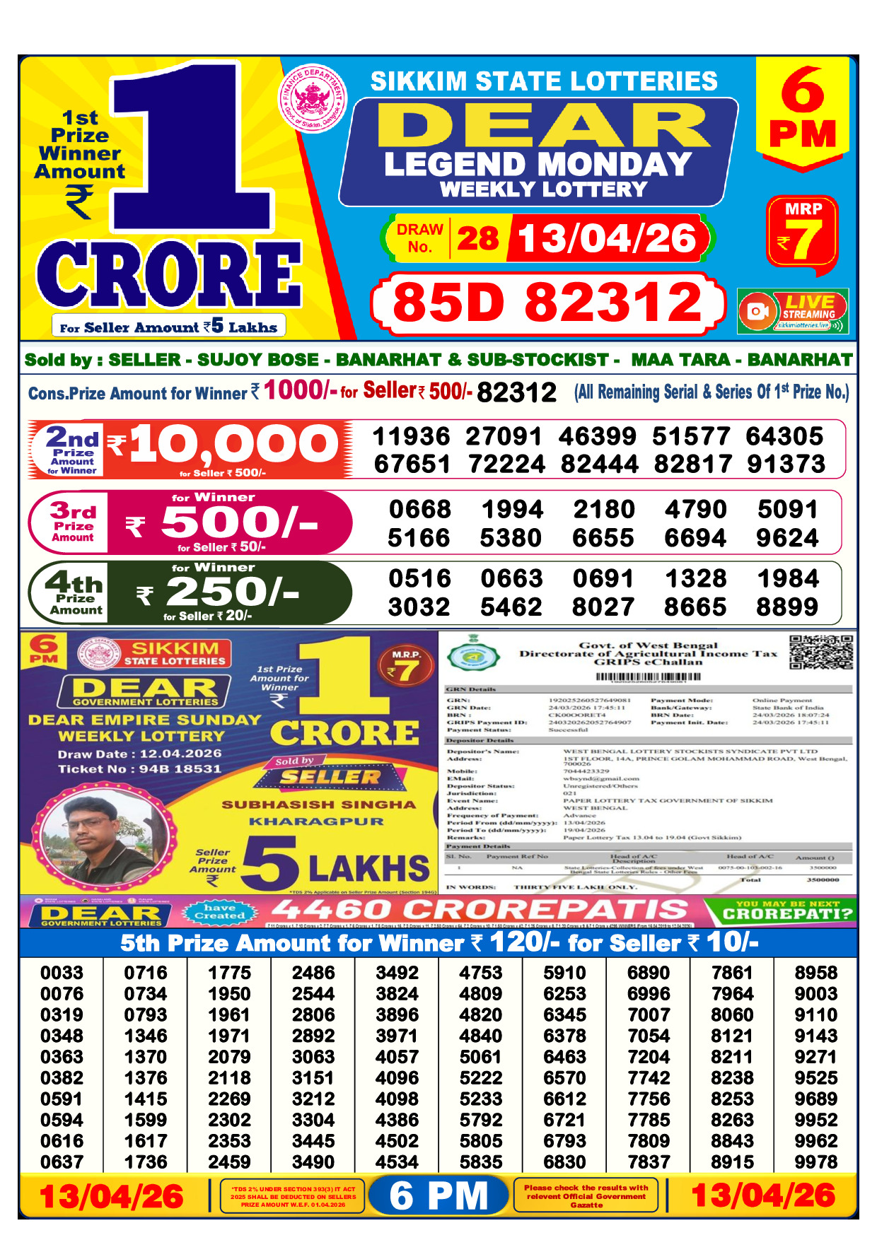 Dear Legend Day Monday 6 PM Lottery Result 13 April 2026