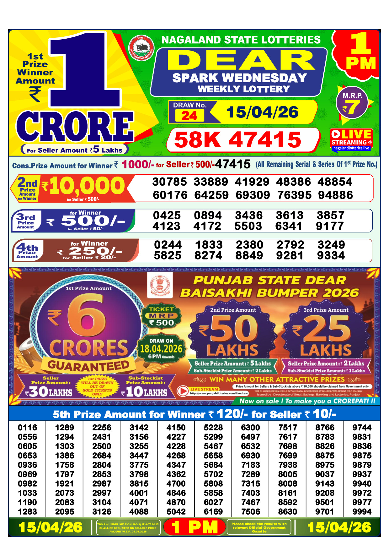 published on 15 April 2026. Download the official lottery result PDF below.