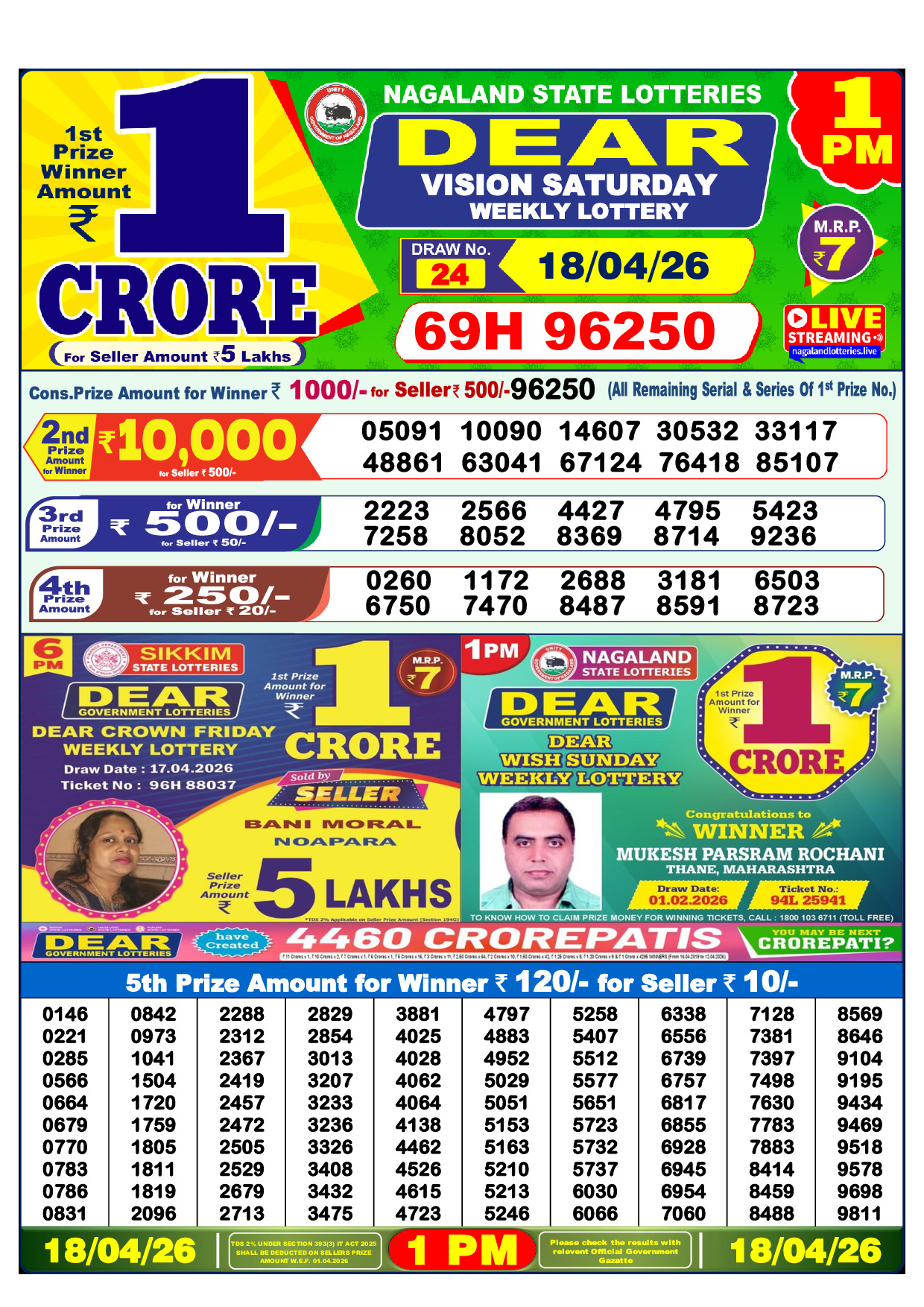 Dear Vision Morning Saturday 1 PM Lottery Result 18 April 2026