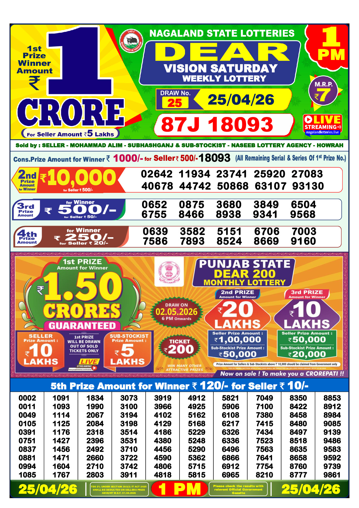Dear Vision Morning Saturday 1 PM Lottery Result 25 April 2026