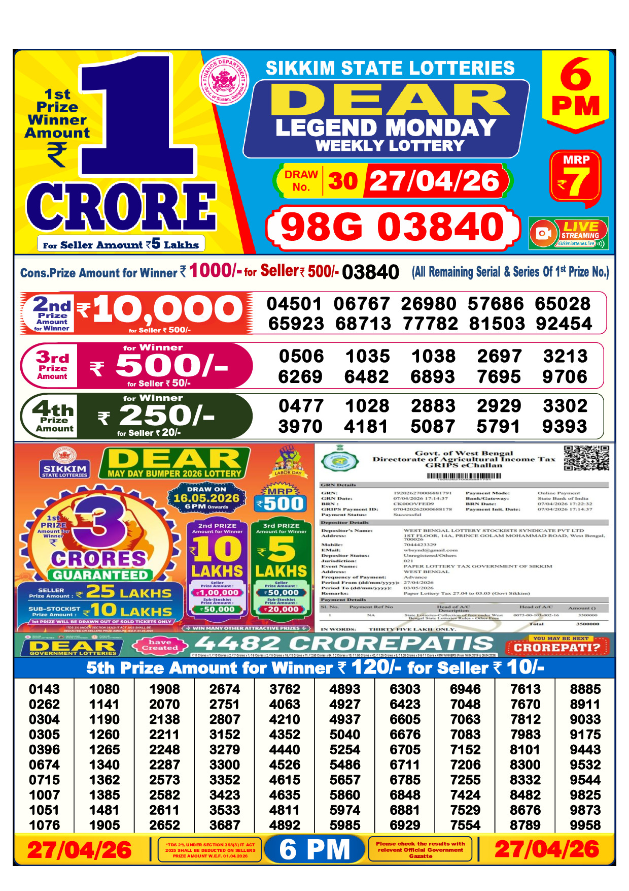 published on 27 April 2026. Download the official lottery result PDF below.